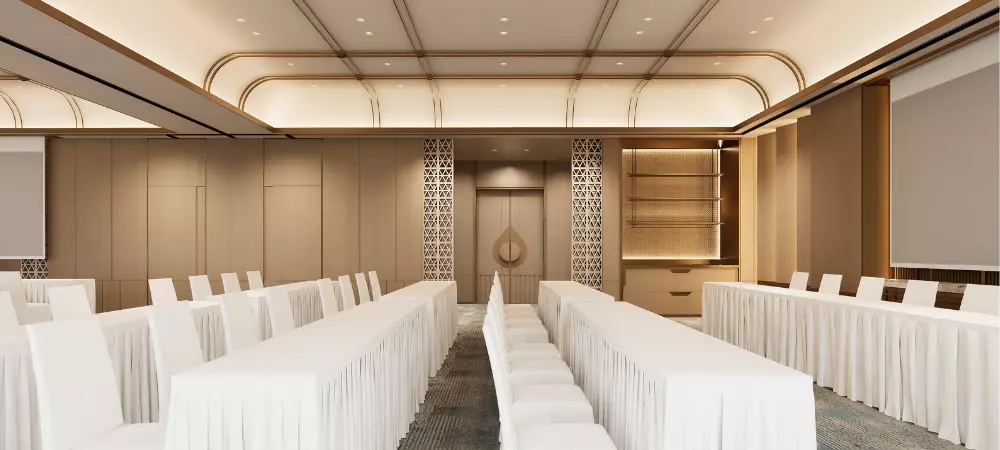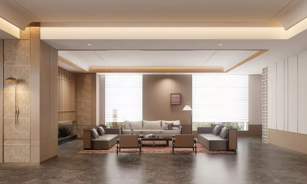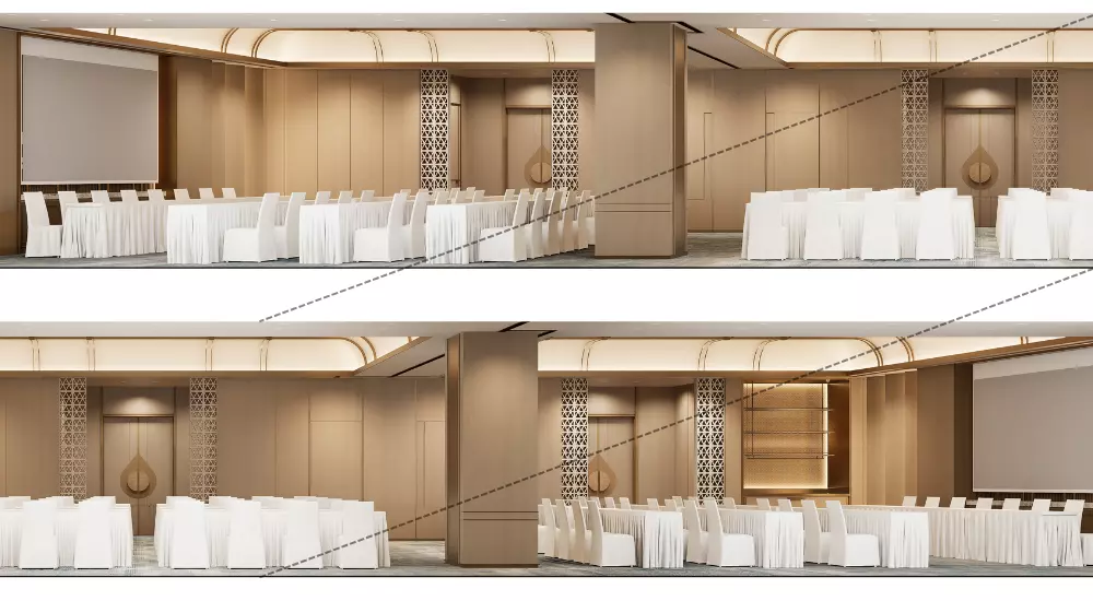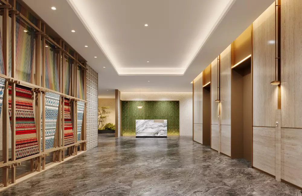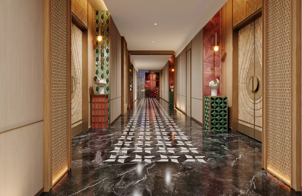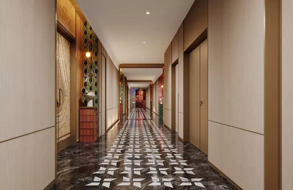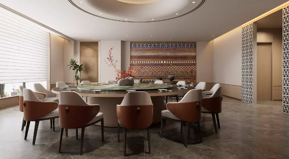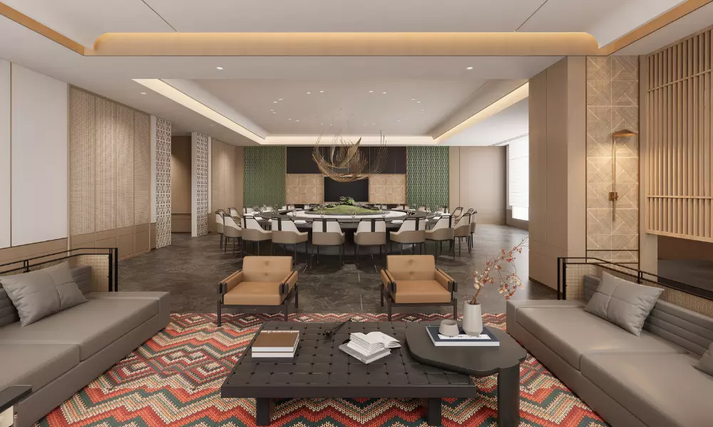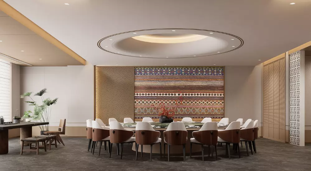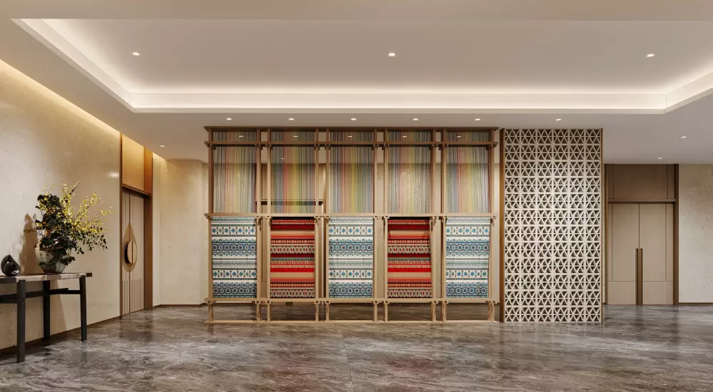 • 水波纹:取自澜沧江的蜿蜒形态,以现代工艺呈现于屏风、地毯与天花线条之上,暗合傣族“依水而居”的生活哲学