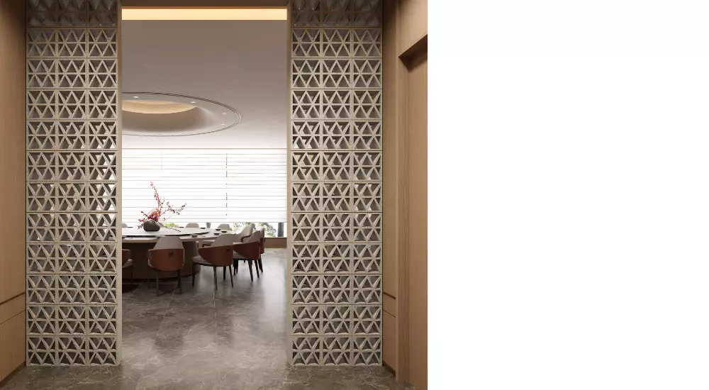 • 八角花与菱形纹:传统织锦中常见的几何图腾,以镂空砖、拼花石材等当代材质重新呈现