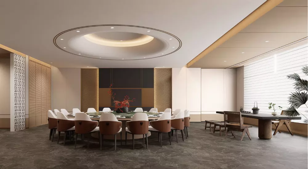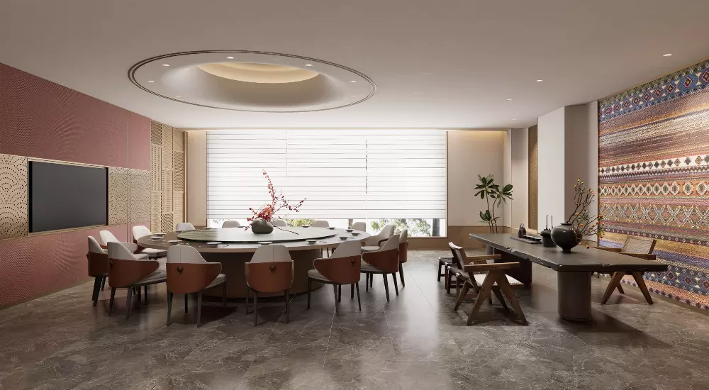 • 主色调:以象脚鼓般的赭石红、佛寺金箔般的暖金为基底,奠定空间醇厚而温暖的基调